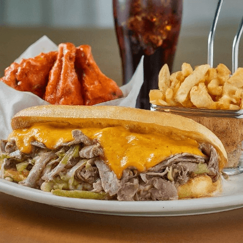 Enjoy your choice of Philly—steak, chicken, shrimp, or a combo—stacked with tender onions and melty provolone on a house-made toasted roll, paired with crispy, saucy wings, golden fries, and a refreshing drink. Our signature flavors make this the ultimate comfort meal.