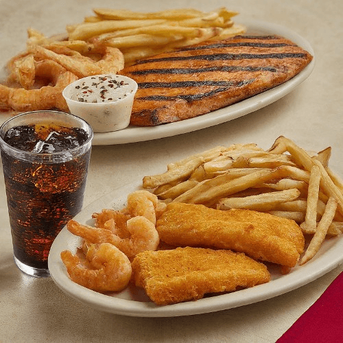 Choose fried or grilled rich sea trout, served with your favorite side and refreshing drink. Finished with a crispy, golden crust or perfectly seared flavor, this signature dish highlights fresh, local seafood at its best.
