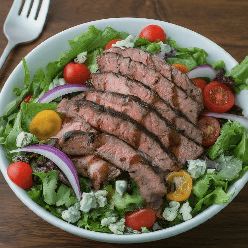 Rich slices of grilled steak atop a bed of crispy fresh greens, ripe tomatoes, drizzled with our house-made dressing. A signature salad that’s hearty, flavorful, and satisfying in every bite.