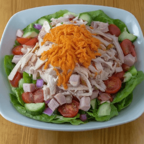 Savory slices of turkey and ham served over crispy fresh greens with ripe tomatoes, cucumbers, and drizzled with our creamy house-made dressing. A signature salad that’s hearty, flavorful, and satisfying in every bite.