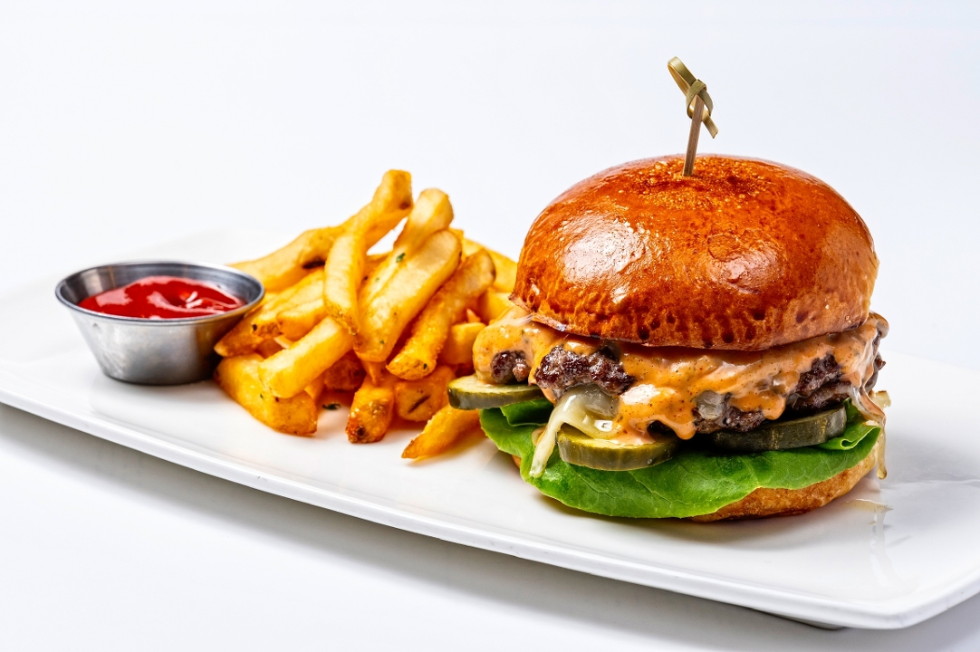 All Beef Patties, White American, Chopped Iceberg, Pickles, Burger Sauce, Brioche. Choice of French Fries or a Mixed Green Salad. Add Pecan Smoked Bacon +2