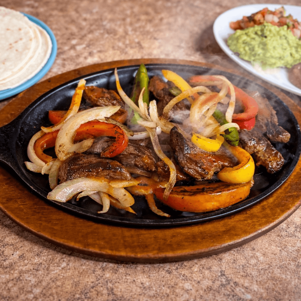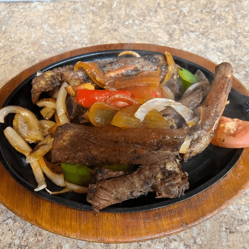 Our fall off the bone pork rib fajitas cooked in our own citrus marinade and spices. Grilled with tomatoes, bell peppers, and onions. Served with guacamole and beans