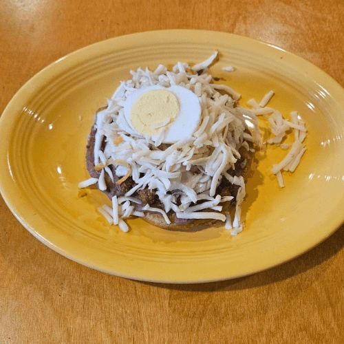 A seasoned fried corn flour tortilla topped with refried beans, pickled cabbage, grated cheese, sliced egg, and your choice of ground beef or shredded chicken