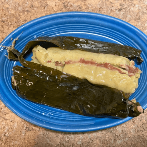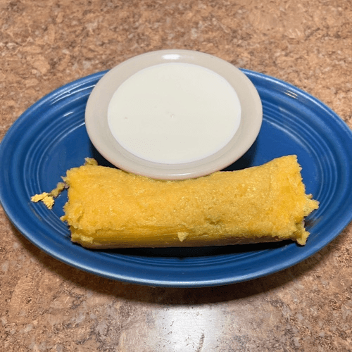 Corn tamale made with fresh corn, cornmeal and cane sugar.