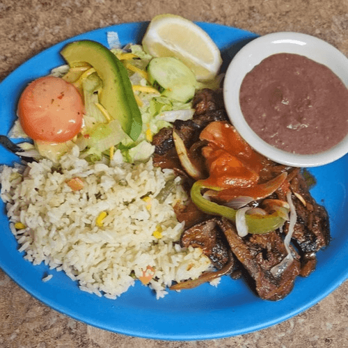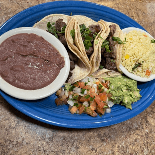 Three corn tortillas filled with carved beef steak, served with rice, beans, pico de gallo, cilantro, onions and guacamole. Con arroz y frijoles