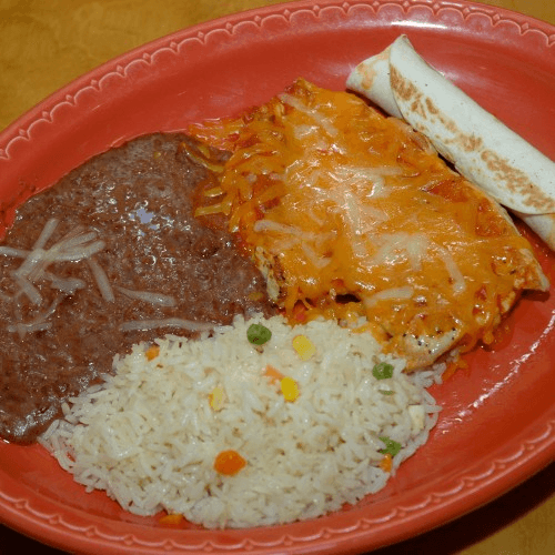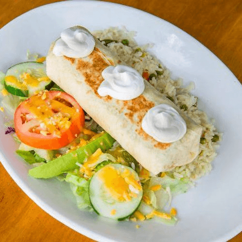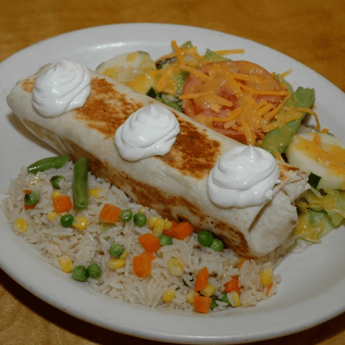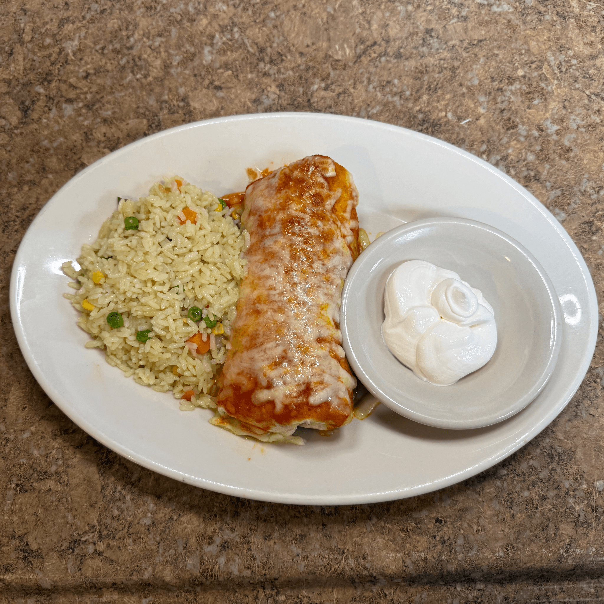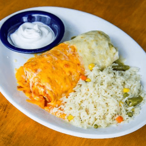 Shredded beef and beans rolled in a flour tortilla, topped with fresh enchilada sauce and melted cheese. Served with sour cream and rice