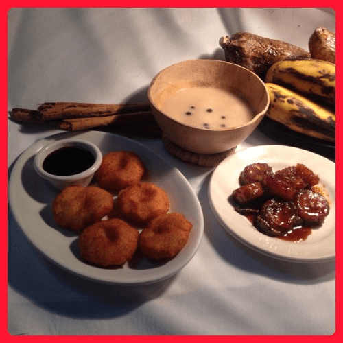 A typical salvadoran dessert consisting of a hot corn flour drink with a hint of pepper, fried cassava flour nuggets covered in caramelized brown sugar, along with diced plantains in brown sugar, honey, and cinnamon