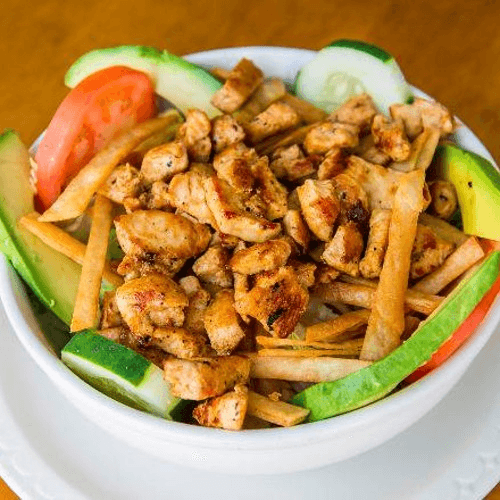 Crisp romaine lettuce, tomato, cucumber, avocado, tortilla strips, Monterrey Jack cheese, and diced grill chicken breast. Served with our aderezo. Lechuga romaine, tomate, pepino, aguacate, queso, tortillas, pollo, y dressing