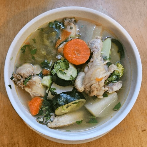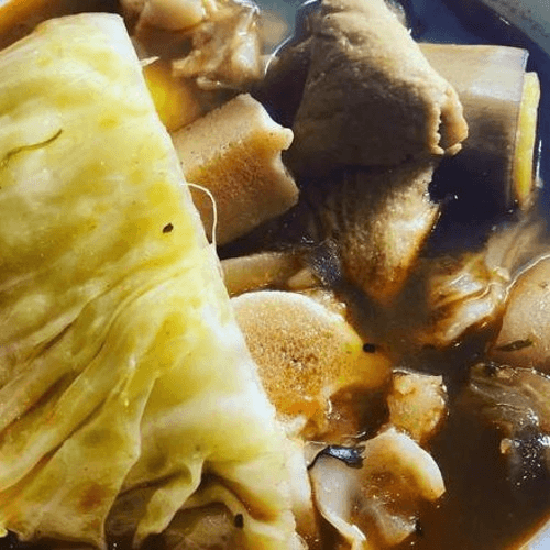 A delicious beef consumé, including tender morsels of beef short-rib, cabbage, cassava, corn, and plantains