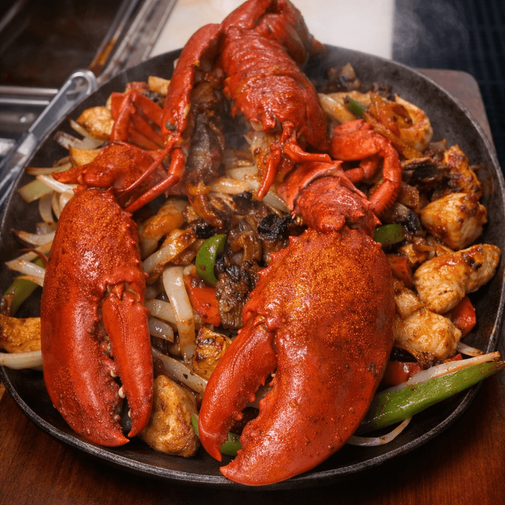 Serves two. Our famous surf and turf fajita with marinated steak, jumbo shrimp, chicken and a full sautéed lobster. Served sizzling with ranchera sauce, grilled tomatoes, onions and bell peppers. Served with rice, beans, guacamole, sour cream, and corn tortillas (or hand - made corn tortillas)