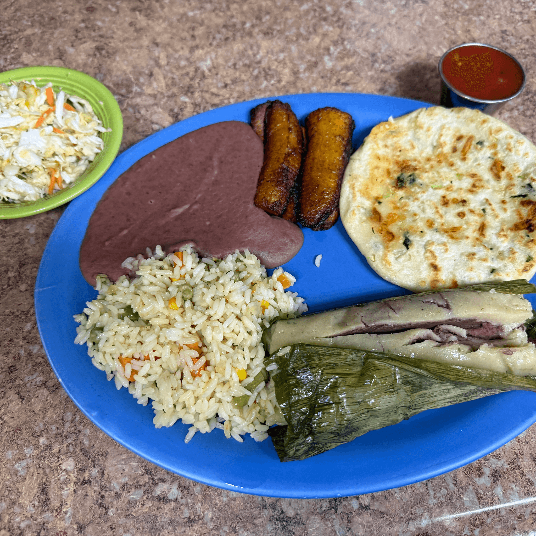 A chance to savor the most typical Salvadoran cuisine consisting of one chicken tamale, one pupusa, plantains, rice, and beans