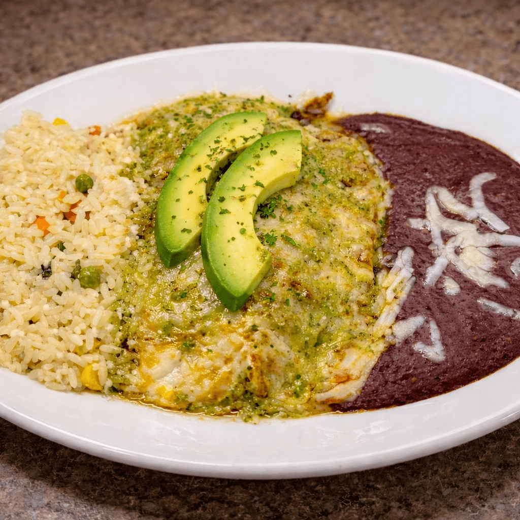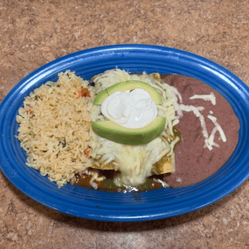 Two corn tortillas stuffed with shredded beef and covered with our homemade tomatillo sauce. Topped with melted cheese, a slice of avocado, and sour cream. Served with rice and beans. Dos enchiladas de res, con arroz y frijoles