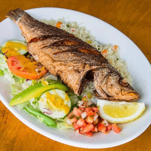 Fried red snapper served with rice, salad, and a small baked potato. Un pescado rojo entero, frito y servido con arroz, ensalada, y un papa al homo