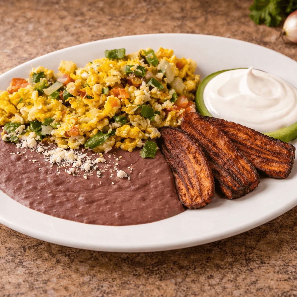 Savor this typical Salvadoran dish of beans, rice, sour cream, avocado, and scrambled eggs with tomatoes, green peppers, and onions