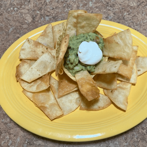 A good portion of our fresh guacamole served in a flour tortilla cup and topped with sour cream, served with fresh chips