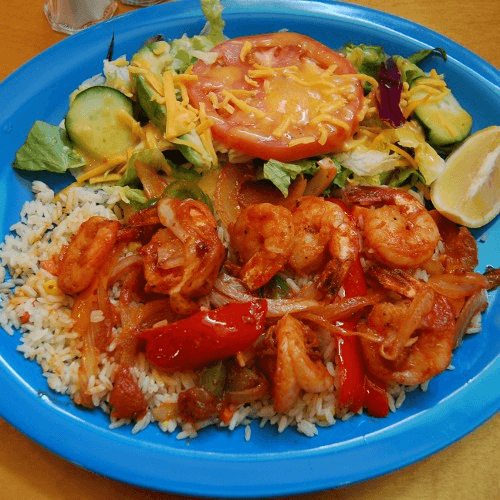 Tender shrimp grilled with tomatoes, onions, bell peppers, and ranchera sauce. Served with rice and guacamole