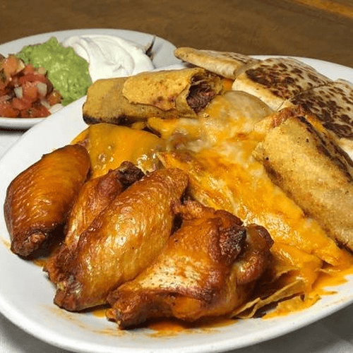 Cheese quesadilla, nachos, chicken wings, taquitos, sour cream, guacamole, and pico de gallo