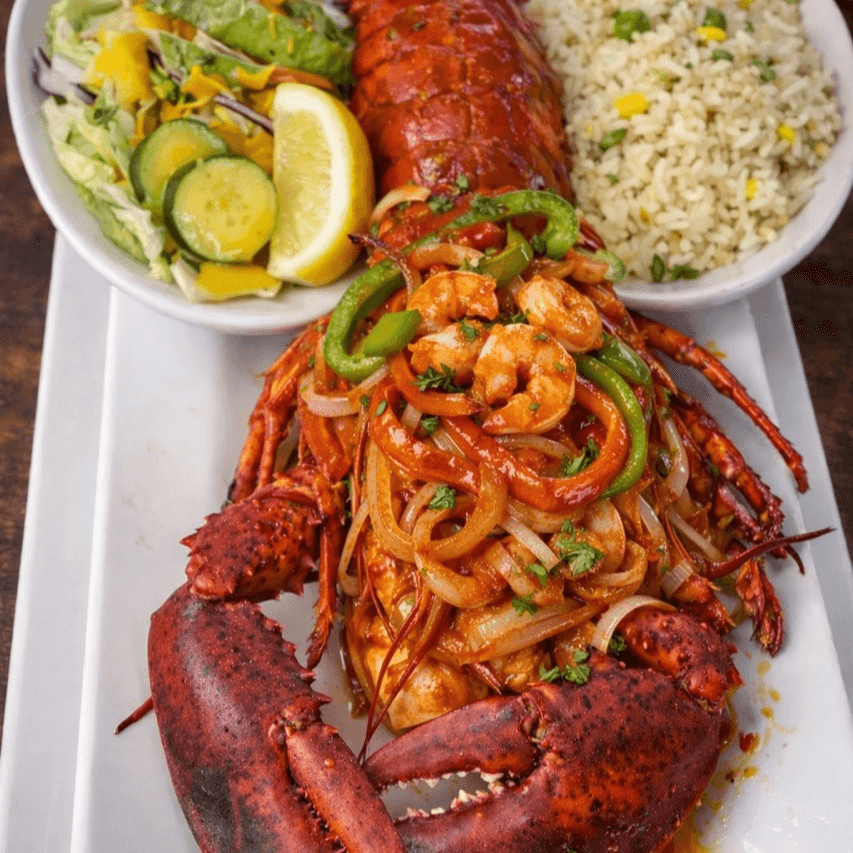 Delicious sautéed lobster stuffed with our homemade crab and shrimp blend. Served with rice and salad. Una langosta rellena con camarones pequeños y carne de cangrejo. Servida con arroz y ensalada
