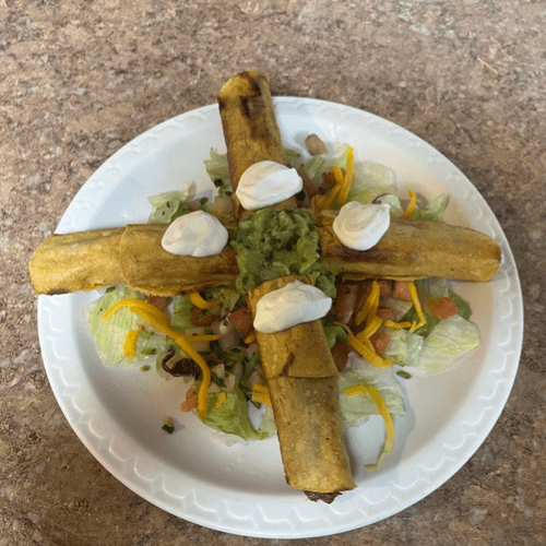 Your choice of shredded beef or chicken, rolled in a corn tortilla, fried and topped with sour cream and guacamole