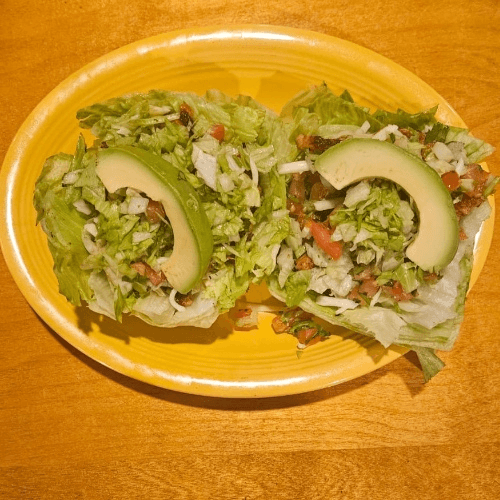 2 lettuce shell tacos filled with grilled chicken, grilled steak, pico de gallo, avocados, and cheese