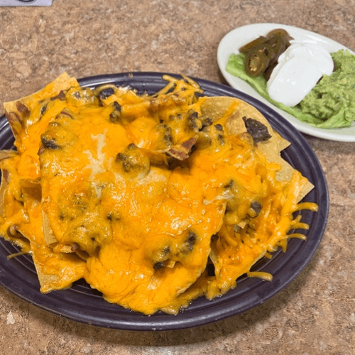 Corn chips covered with refried beans, cheese, diced jalapeño peppers, topped with guacamole and sour cream