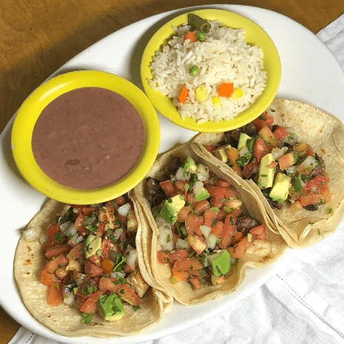 Three corn tortillas individually filled with: beef steak, grilled chicken, and beef tongue. Stuffed with a blend of cilantro, pico de gallo, and avocado. Served with rice and beans. Tres tacos: pollo, carne asada, y lengua de res. Con cilantro, pico de gallo, y aguacate. Servido con arroz y frijoles
