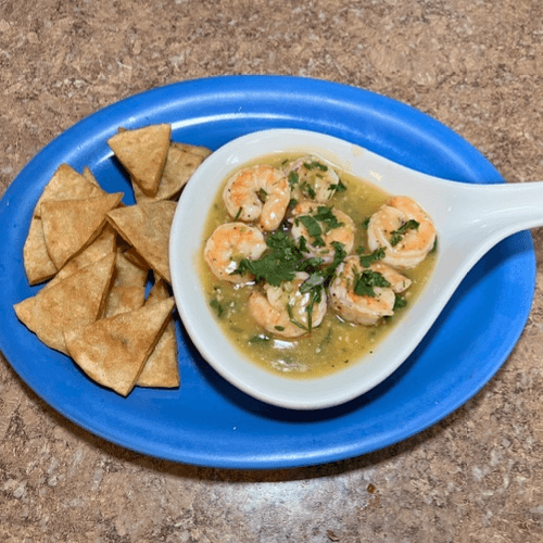 Jumbo shrimp sautéed in garlic butter and cilantro. Served with freshly made thick corn tortilla chips and a lemon crown