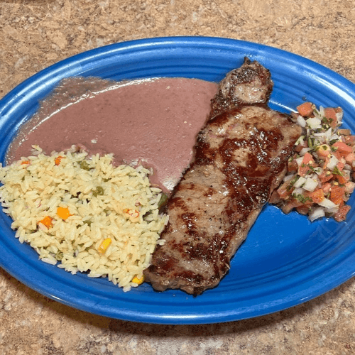 Our perfectly seasoned tender NY strip steak, served with pico de gallo, rice and beans