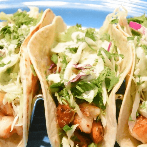 Three flour tortillas stuffed with grilled shrimp, shredded cabbage, and our homemade jalapeño cilantro cream sauce. Served with rice