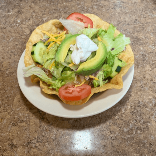 A crisp flour tortilla shell filled with grilled chicken breast, avocado, lettuce, tomatoes, and cheese. Una tortilla de harina frita, rellena de pollo asado. Cuvierta con ensalada y aguacate