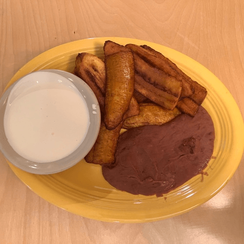 Our Salvadoran combo with one cheese and zucchini pupusa, one pisque tamale (bean), fried plantains, rice, and beans.