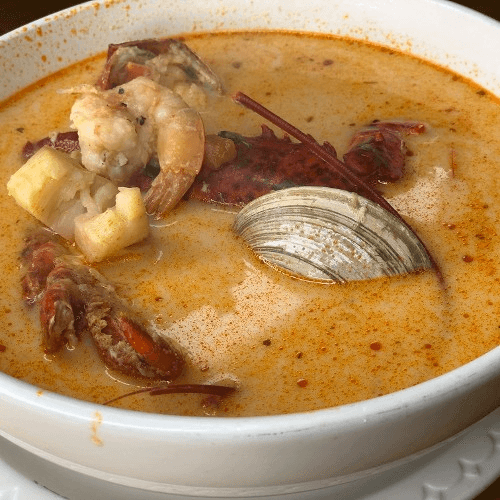 A large seafood soup made with lobster, jumbo shrimp, clams, and scallops in a creamy blend of herbs and spices. Una sopa grande con langosta, scallops, camarones, y almeja con crema