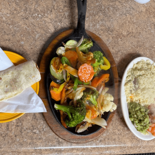 Seasonal vegetables. Fresh sautéed bell peppers, onions and zucchini. Served sizzling with our homemade ranchera sauce, guacamole, rice and corn tortillas