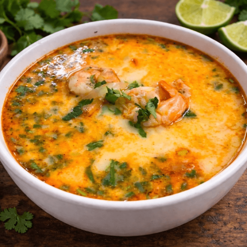 Shrimp soup made with shrimp broth, jumbo shrimp, green peppers, onions, tomatoes, and egg