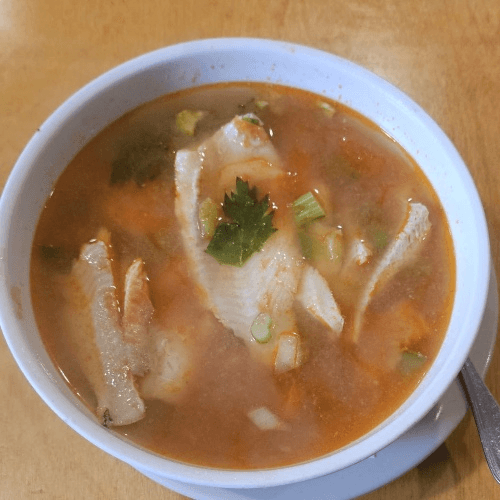Shrimp and fish broth, with jumbo shrimp, flounder, green peppers, onions, and tomatoes