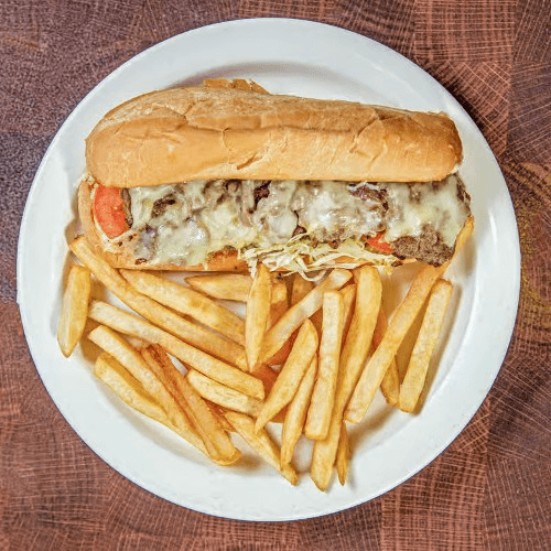 Tender sliced ribeye with sauteed onions, provolone cheese, lettuce, tomato and mayo