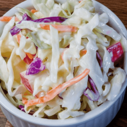 Battered and crispy fried served with tartar sauce french fries and coleslaw.