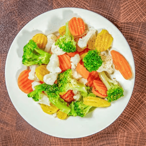 Marinated and broiled chicken breast with tomato, peppers, onions and sauteed mushrooms. Served with mixed veggies.