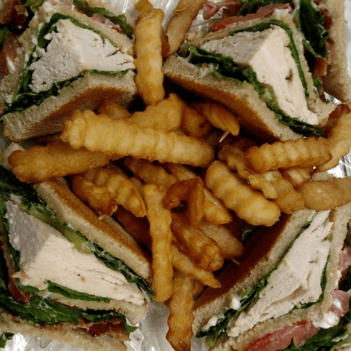 Sliced Turkey, mixed greens, tomatoes, cucumbers, roasted peppers boiled egg, olives, red onions, bacon and cheddar cheese