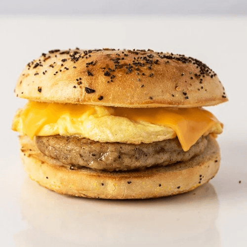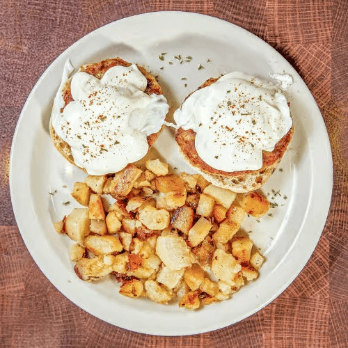 Toasted English muffin topped with sausage patties, two poached eggs and hollandaise sauce
