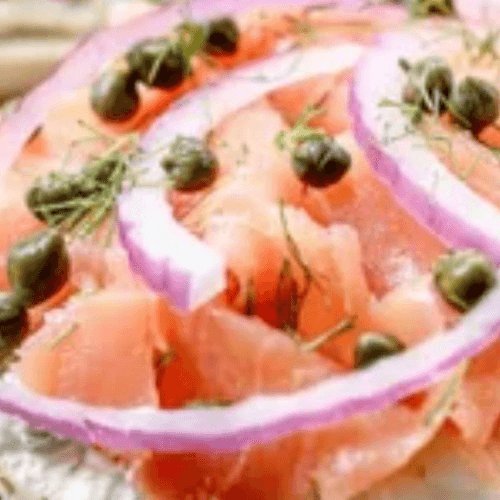 Grilled salmon fillet on a bed of salad greens with mixed veggies olives and capers