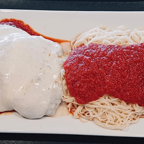 Breaded veal topped with melted cheese and marinara sauce over spaghetti.