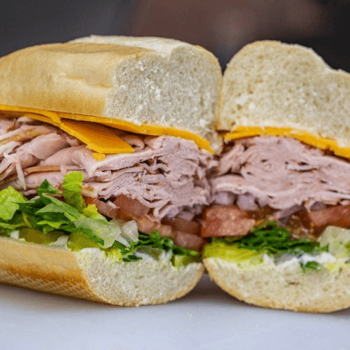 Thinly sliced chicken breast with sauteed onions, provolone, lettuce, tomato and mayo
