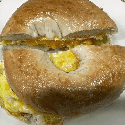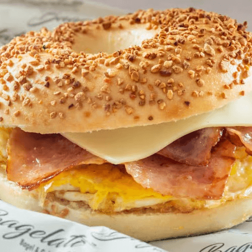 Ham, bacon, roasted peppers, sautéed red onions and two types of cheese