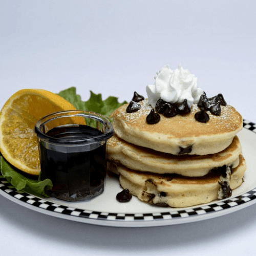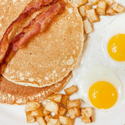 Three buttermilk pancakes, two eggs any style, home fries and bacon
