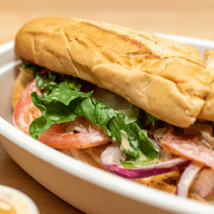 Warm slices of chicken breast, fresh lettuce, tomato and American cheese served on a sub roll or as a wrap